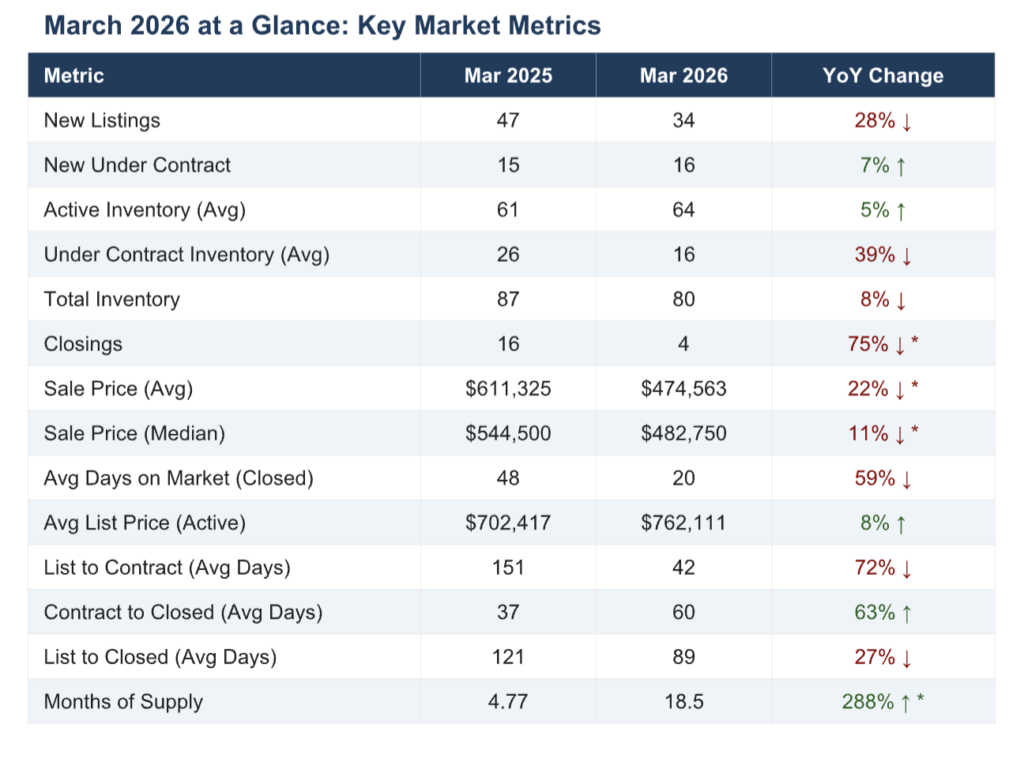 March 2026 looks unusual on paper because it is unusual — but for explainable reasons. The February ice storm created a pipeline delay that compressed closings and distorted price metrics. The underlying signals — 16 new contracts, 20-day average DOM, faster list-to-contract times — point to a market that’s functioning, not stalling.