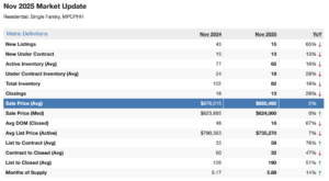 Inventory is down slightly (-16%) from last year, but months of supply crept up to 5.88, inching us closer to a balanced market. Homes are taking longer to go under contract (59 days on average), but once under contract, they’re closing quickly—just 32 days.